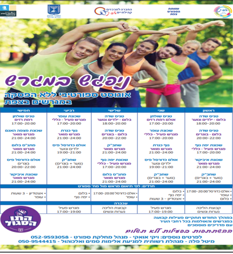 בעיריית צפת יחד עם המחלקה לביטחון קהילתי למניעת סמים ואלכוהול , מחלקת הספורט והחברה למרכזים קהילתיים בנו תכנית מיוחדת וענפה של פעילות ספורט לכל אורך חודש אוגוסט.