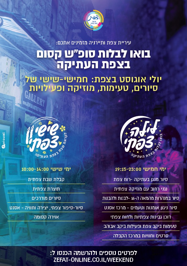 Thursday nights in Zefat means strolling the old city, tasting our local wines and cheeses, guided tours, listening to fine music and appreciating our burgeoning art scene
